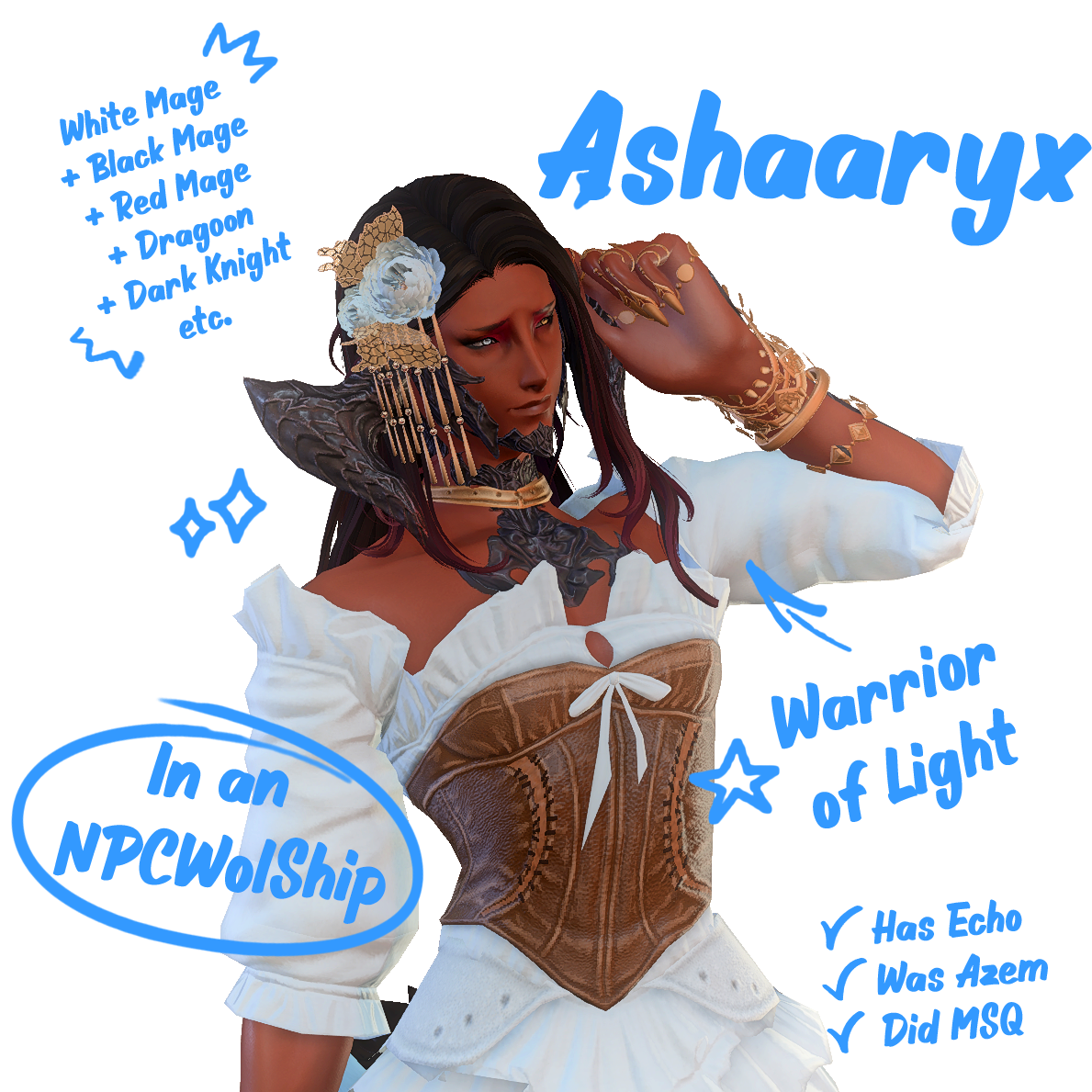 My name is Alek and I'm Ashaaryx's mun.I am a fairly active FFXIV player based in Australia. I am an altaholic, so Ashaaryx is only one of my many characters. If you'd like to find out more about them and me, you can check out my general FFXIV carrd.✘ On principle I don't privately RP with anyone under 18. ✘